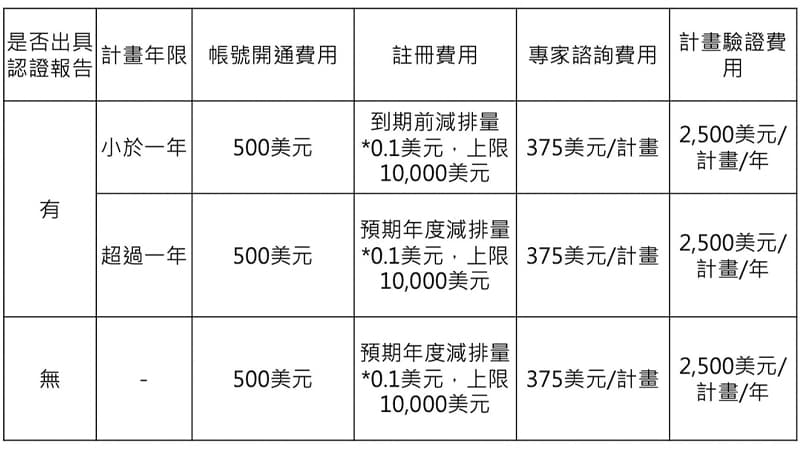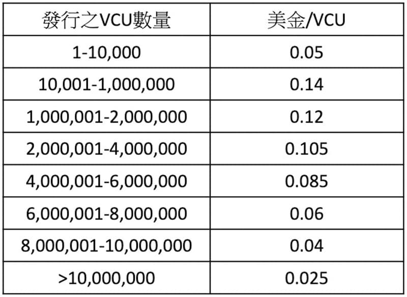 發行VCU所需費用 | 資料來源:Verified Carbon Standard, 2021首先,VCS認證須繳納開通帳戶費500美金,這是一個保證金,未來可做為核發VCU時抵免用。再來還有專家諮詢費用375美金,驗證費用2,500美金/計畫/年,以及依照計畫年限以及是否有提交認證報告再付註冊費,每兩年另外收取維護費,發所需的費用,依照發行數量按累進費率計算。因此,如果不是規模大的案子,很容易不划算。